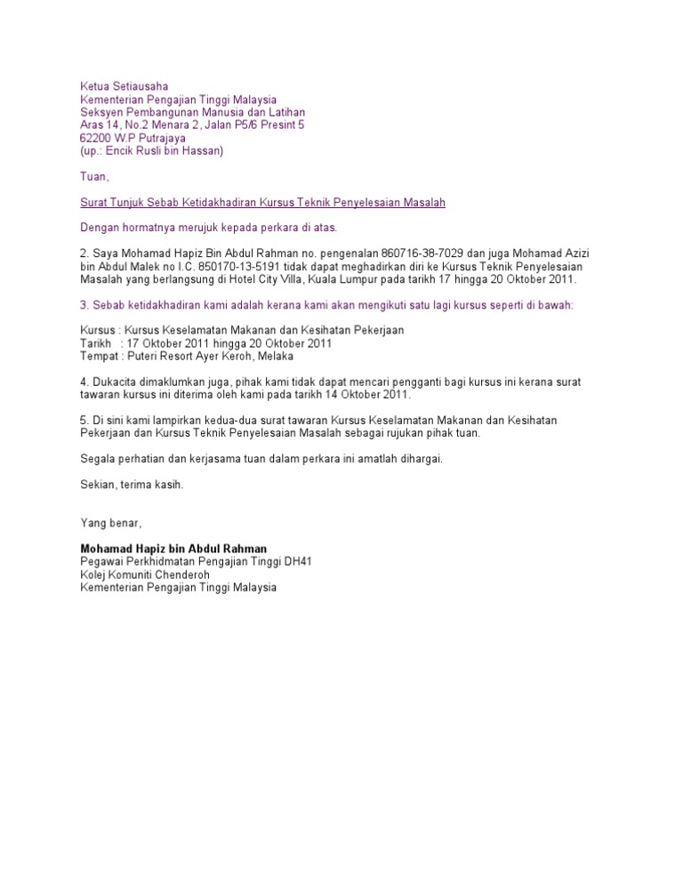 Contoh Surat Rasmi Tunjuk Sebab Tidak Hadir Kursus